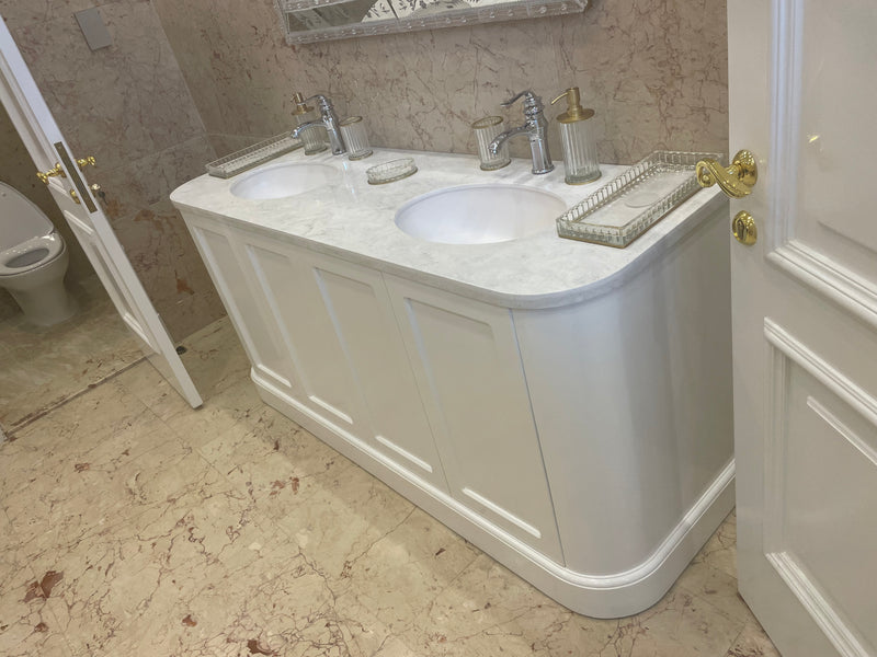 Custom HIMACS bathroom counters with seamless joints and integrated sinks.
