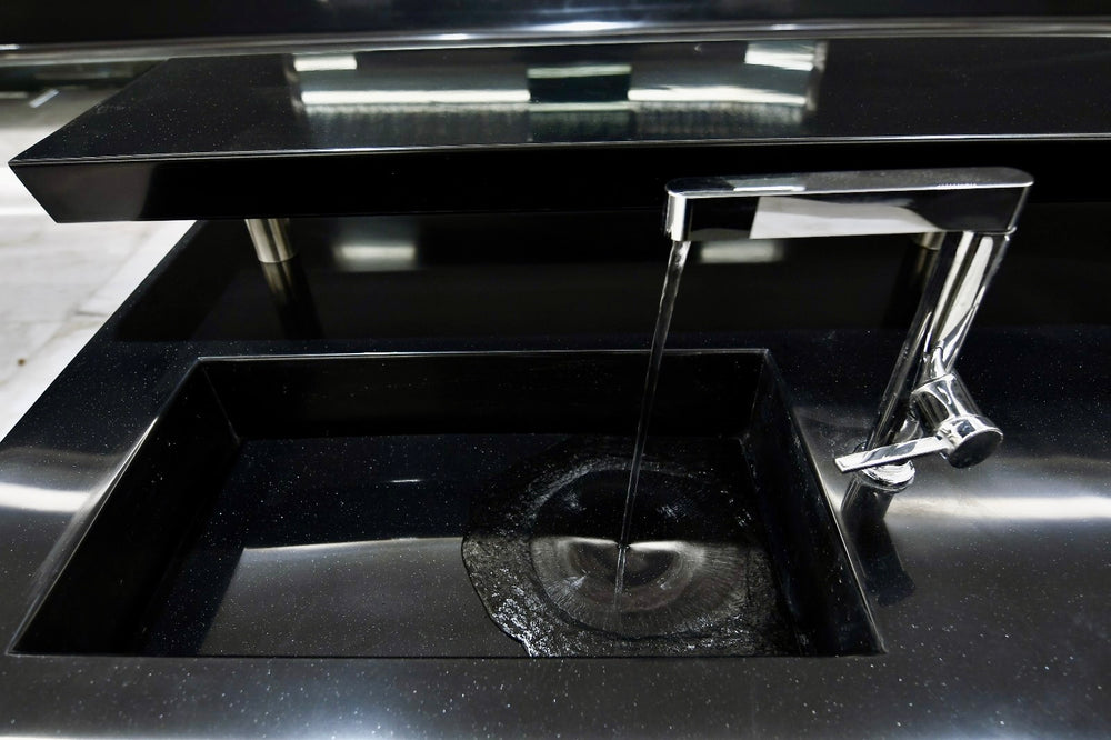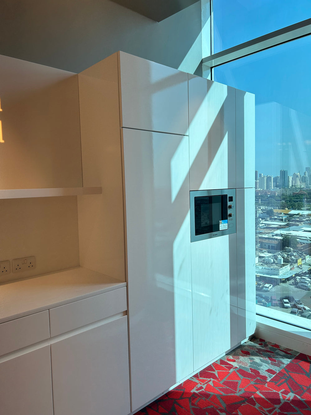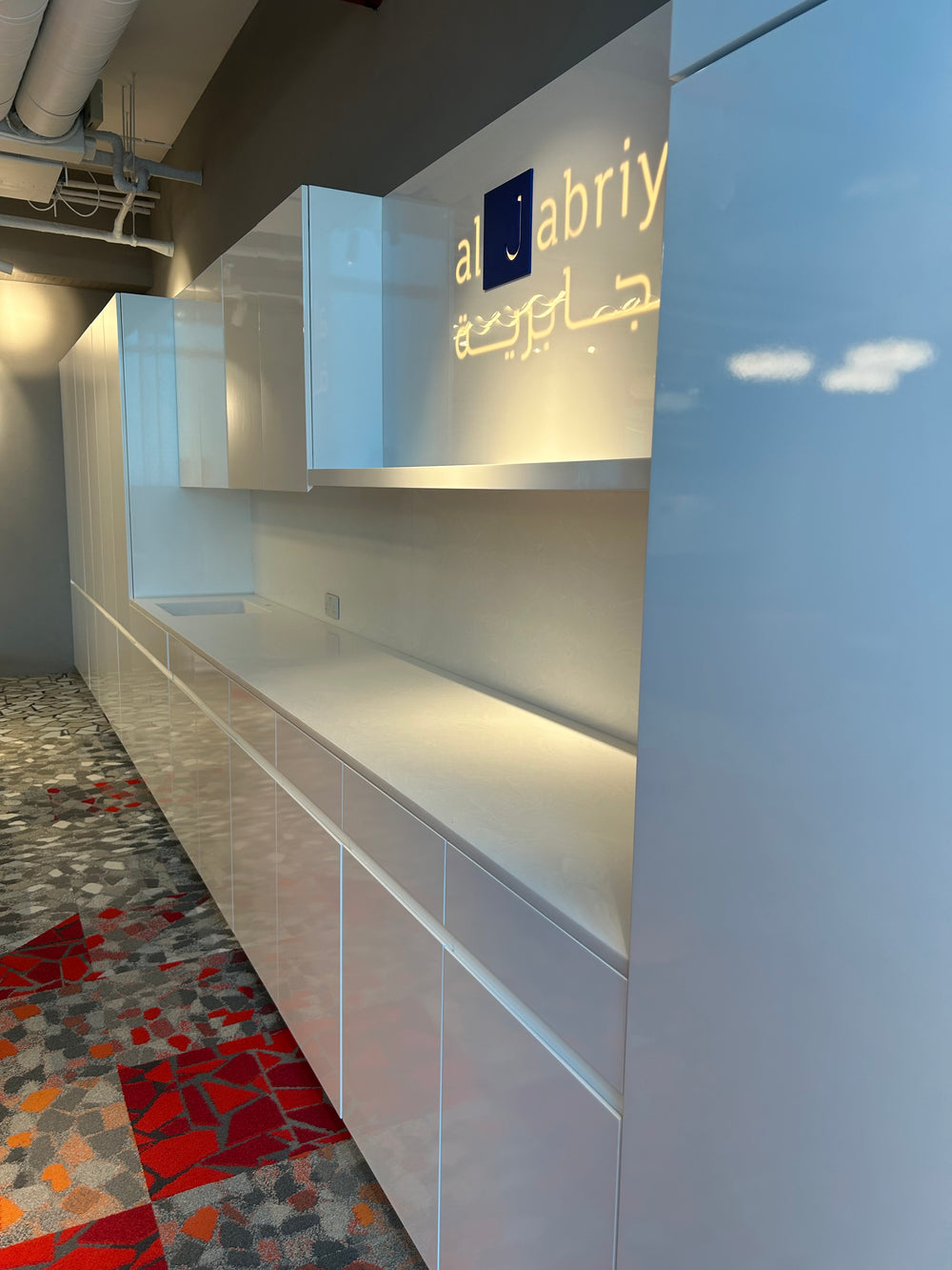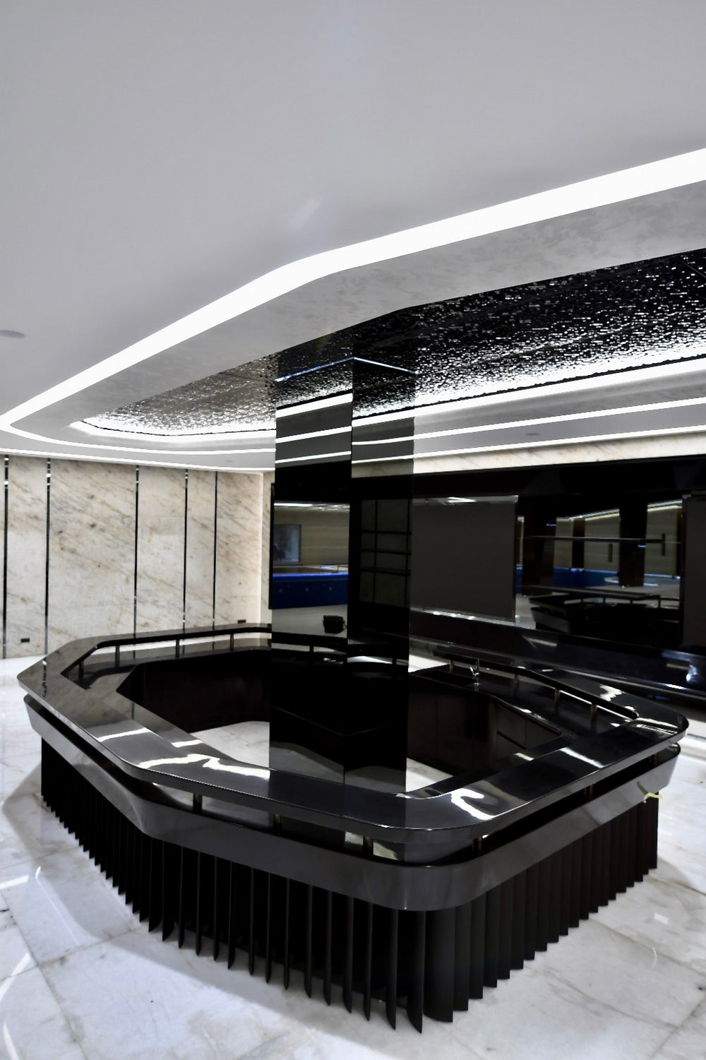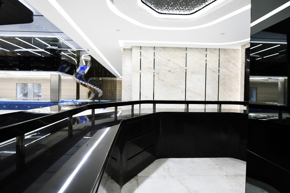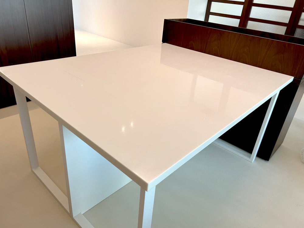 The project is fabricated using HIMACS solid surface for seamless, high-gloss visible surfaces with smooth radiused edges. Aluminum profiles are integrated for structural support and clean detailing, while melamine-coated wood panels are used for interior and backing components. All materials are precision-fabricated to achieve a sleek, modern finish suitable for a luxury residential villa.