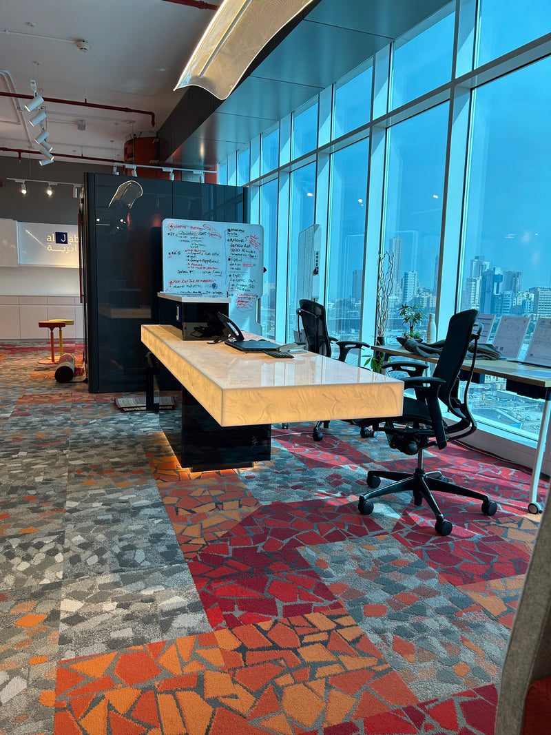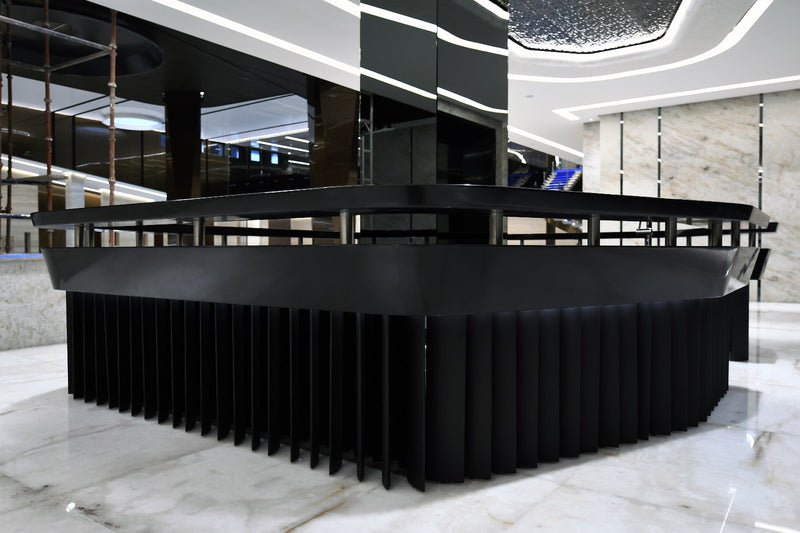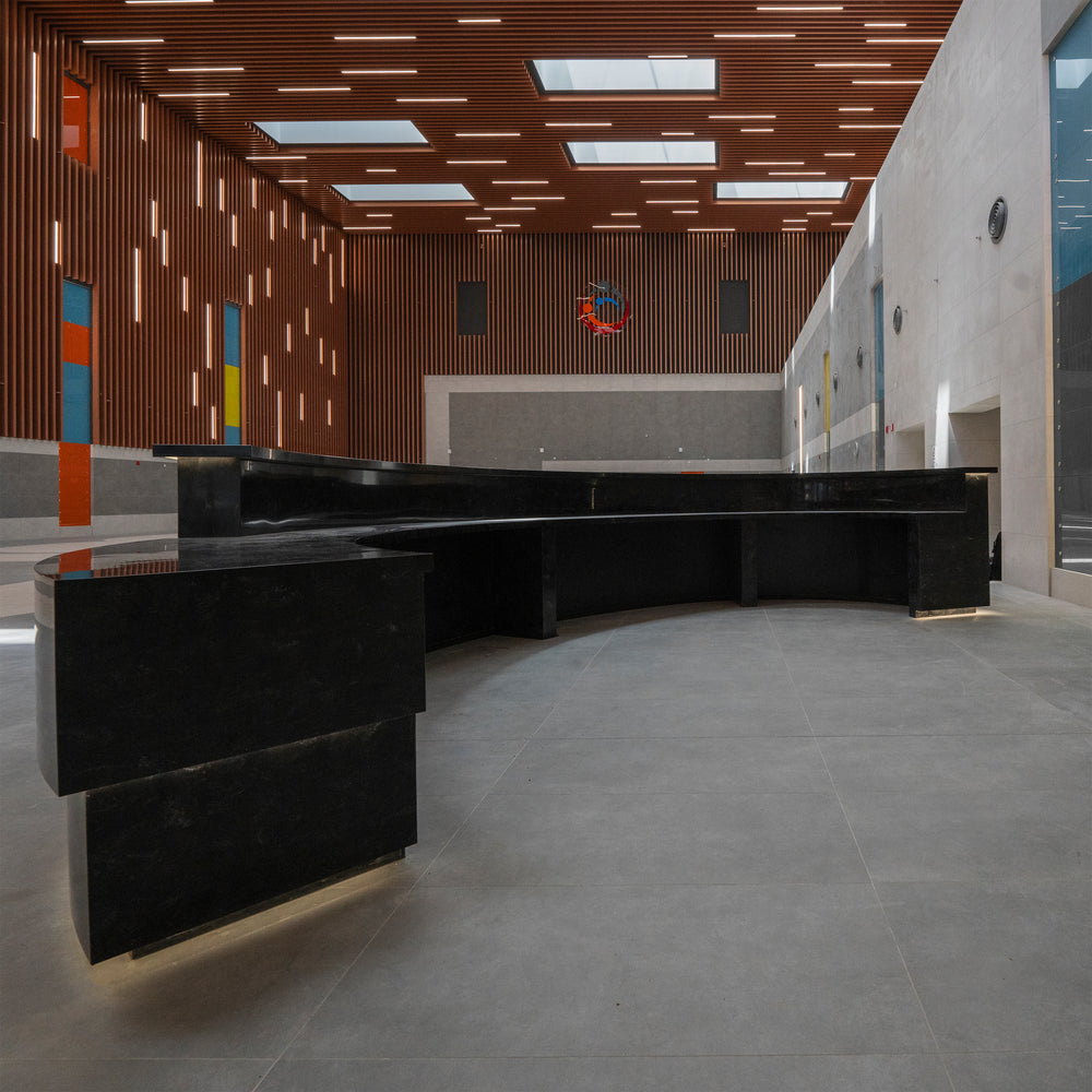The scope includes shop drawings, material coordination, fabrication, and pre-finishing of the custom architectural counter. Work also includes on-site installation, alignment, seam finishing, final polishing, and coordination with lighting and electrical trades. Decorative items and loose furniture are excluded unless noted.