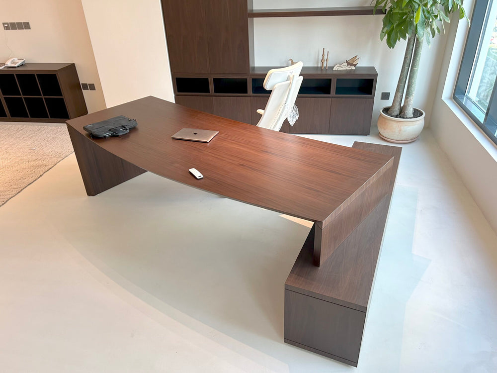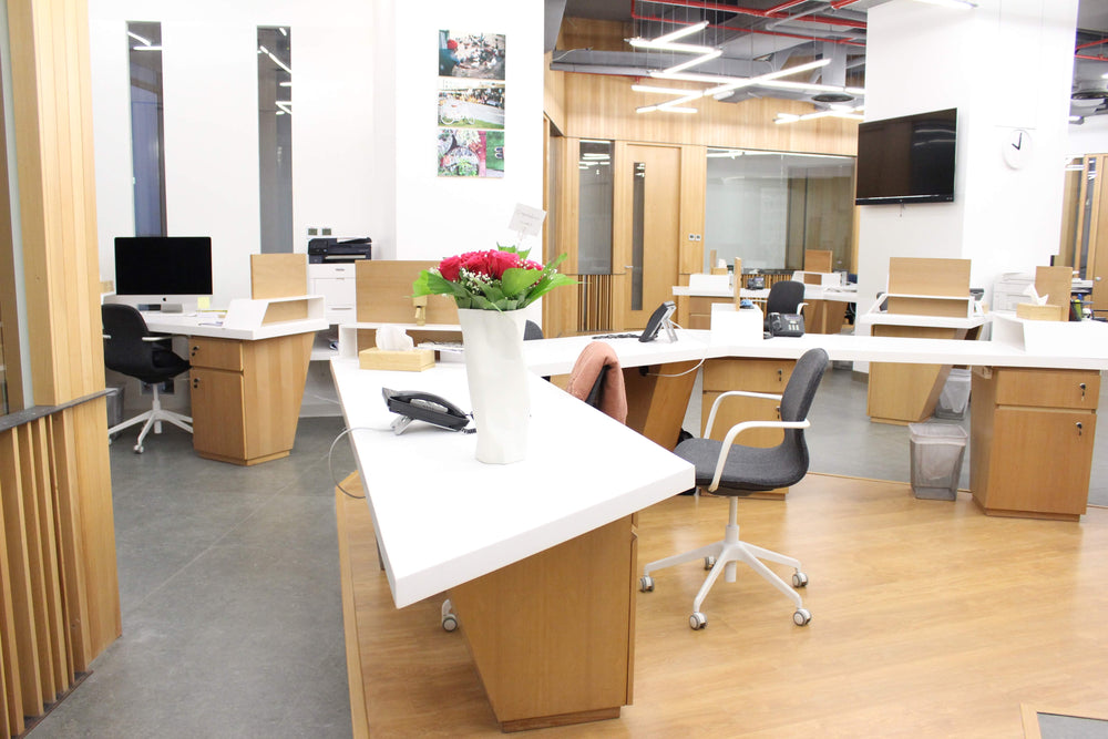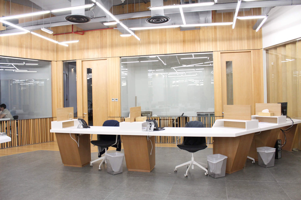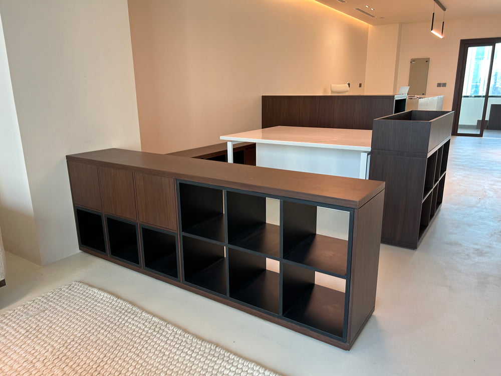 Design, fabrication, and installation of custom office millwork. Includes workstations, desks, wall panels, partitions, and solid surface elements. All items fabricated in-house and installed on site per approved drawings.