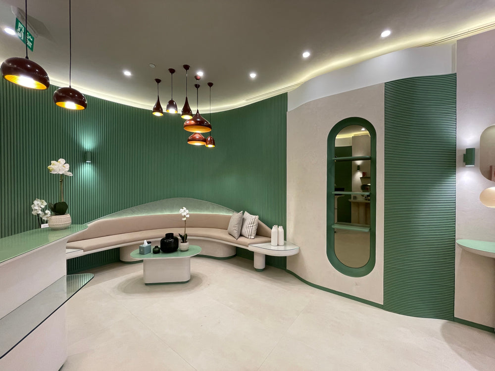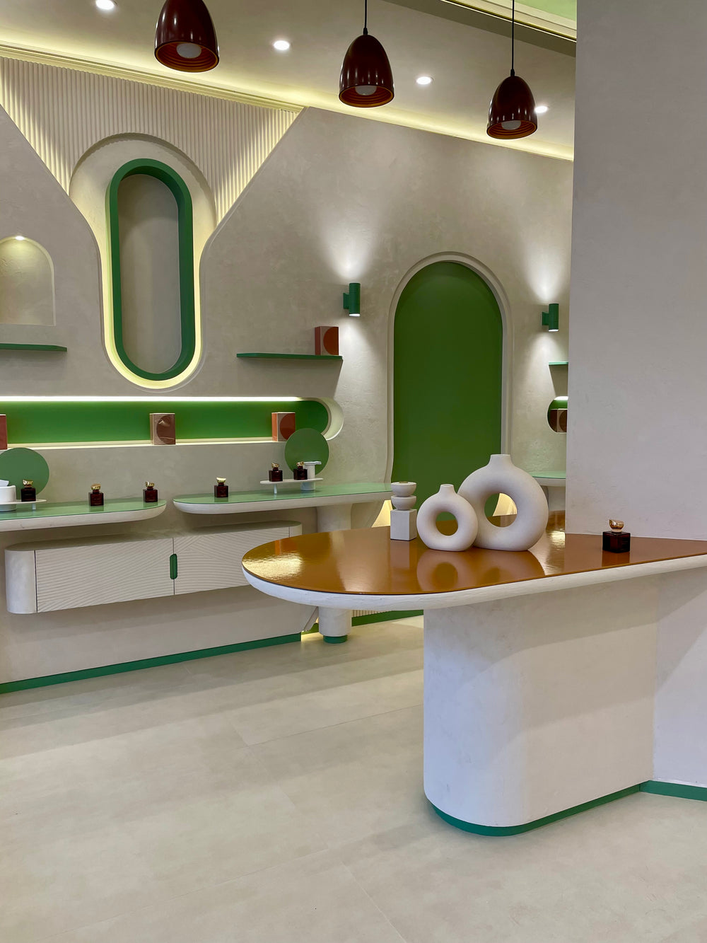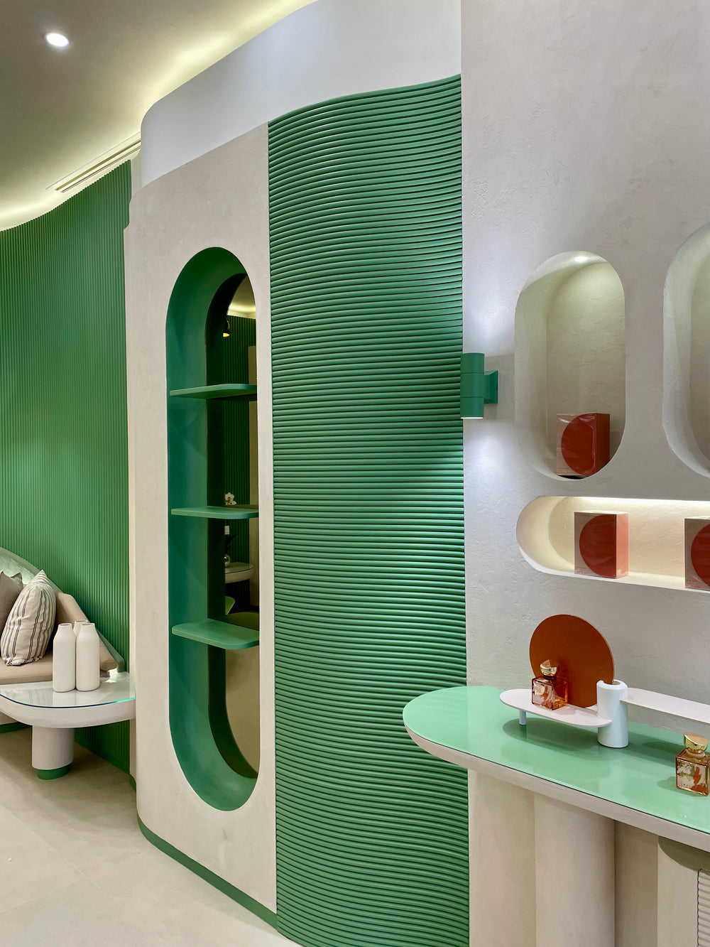 All millwork is fabricated using moisture-resistant MDF and marine-grade plywood for structural stability and precision shaping, with solid wood blocking where required for reinforcement. Curved and organic forms are CNC-machined to achieve smooth, seamless profiles. Visible surfaces are finished with a high-build sprayed polyurethane paint in a satin sheen, using a custom palette of soft off-white, sage green, and muted terracotta tones. Horizontal display surfaces and countertops are fabricated from solid surface material such as Corian or HIMACS, featuring radiused edges, matte finish, and seamless joints. Integrated display elements and shelving are finished to match the overall design, with concealed hardware throughout. LED lighting is incorporated within wall niches using concealed aluminum channels and diffusers to provide warm, even illumination.