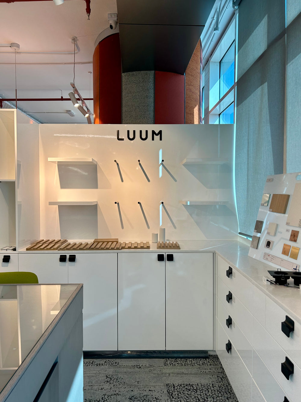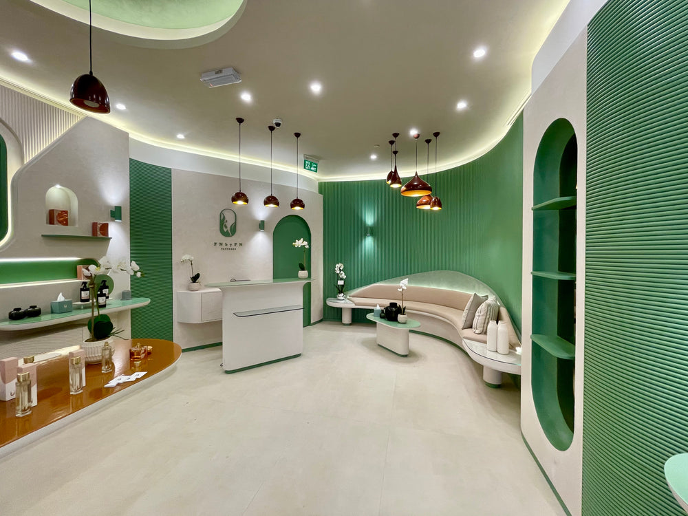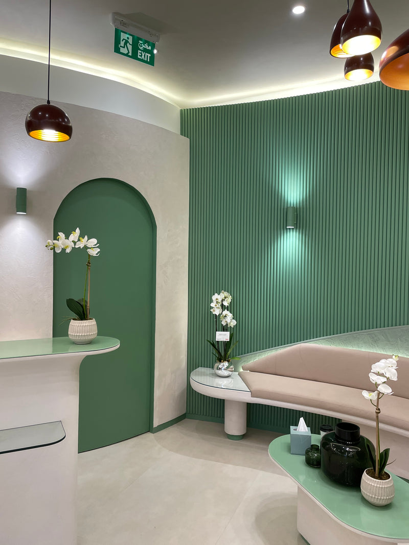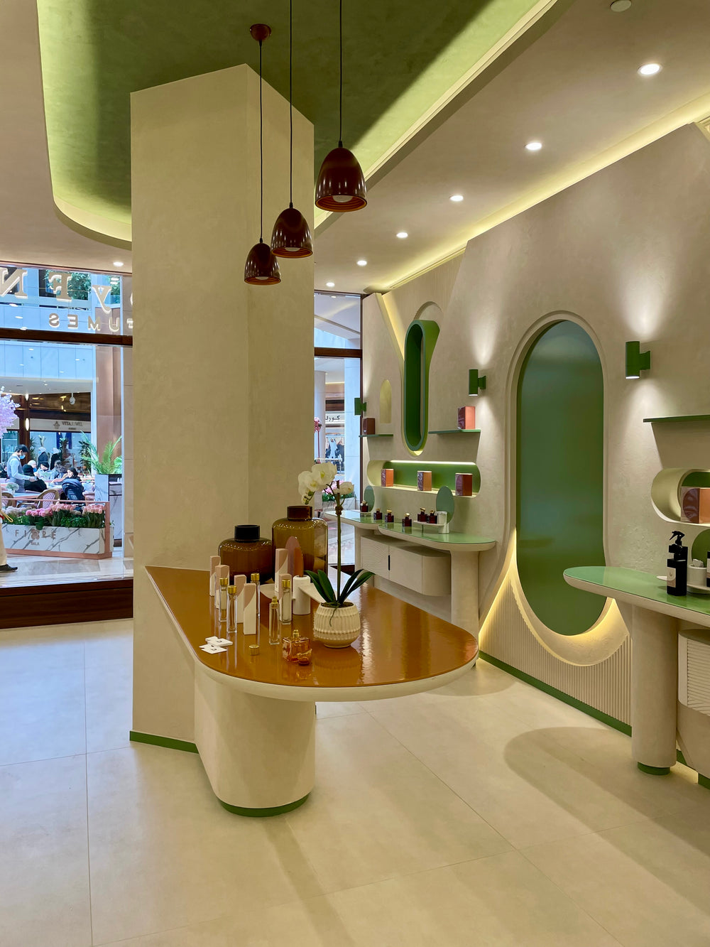 All millwork is fabricated using moisture-resistant MDF and marine-grade plywood for structural stability and precision shaping, with solid wood blocking where required for reinforcement. Curved and organic forms are CNC-machined to achieve smooth, seamless profiles. Visible surfaces are finished with a high-build sprayed polyurethane paint in a satin sheen, using a custom palette of soft off-white, sage green, and muted terracotta tones. Horizontal display surfaces and countertops are fabricated from solid surface material such as Corian or HIMACS, featuring radiused edges, matte finish, and seamless joints. Integrated display elements and shelving are finished to match the overall design, with concealed hardware throughout. LED lighting is incorporated within wall niches using concealed aluminum channels and diffusers to provide warm, even illumination.