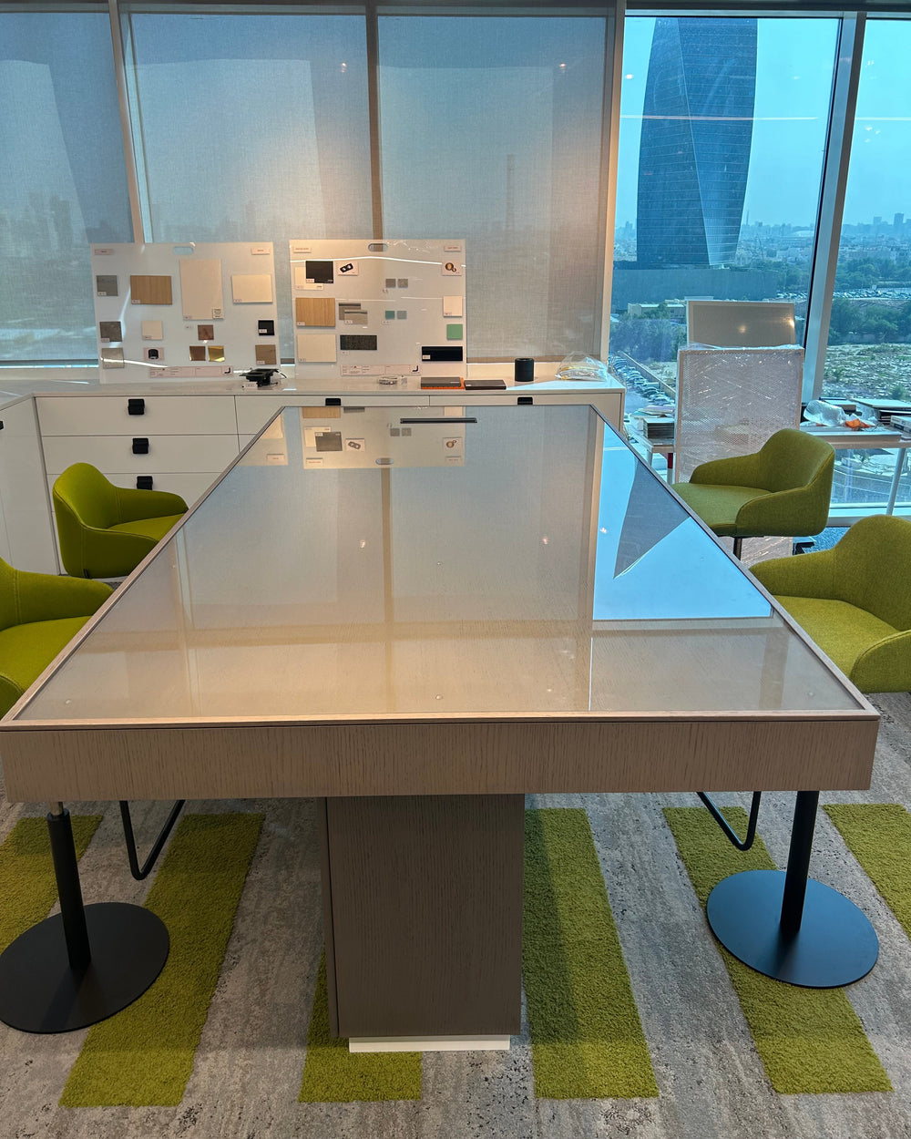 Engineered wood panels Natural wood veneer Solid wood accents HIMACS solid surface Glass partitions Metal hardware and fittings