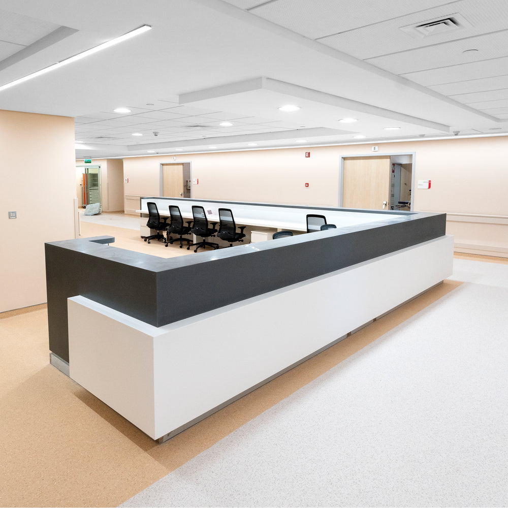 The scope of work included the fabrication and installation of custom nurse stations and reception check-in counters, featuring both curved and straight solid surface countertops. The project incorporated integrated transaction ledges, functional work surfaces, and concealed staff-side storage, with all work coordinated to meet site conditions and hospital standards.